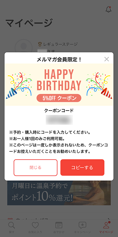 当然ながら誕生日クーポンのメールは届きませんでしたが、数日後にアプリを開いた際に、以下のような画面が表示され、誕生日クーポンを受け取ることができました!