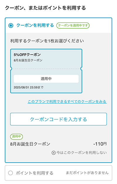 誕生日クーポンの有効期限は、誕生月の月末までです。