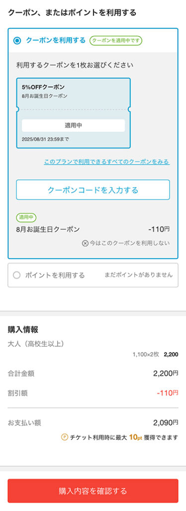 アソビュー!でしらこばと水上公園の入場券を購入する際に、誕生日クーポンを利用しました。