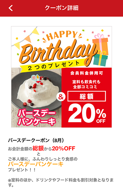 お会計金額の総額から20%OFFとふんわりしっとり食感のバースデーパンケーキプレゼント!