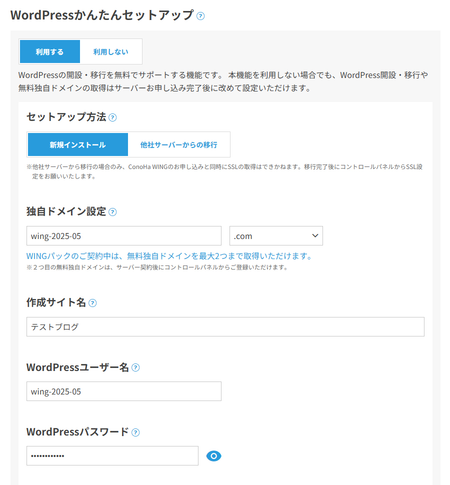 WordPress管理画面にログインする際のパスワードになります。後からでも変更可能です。