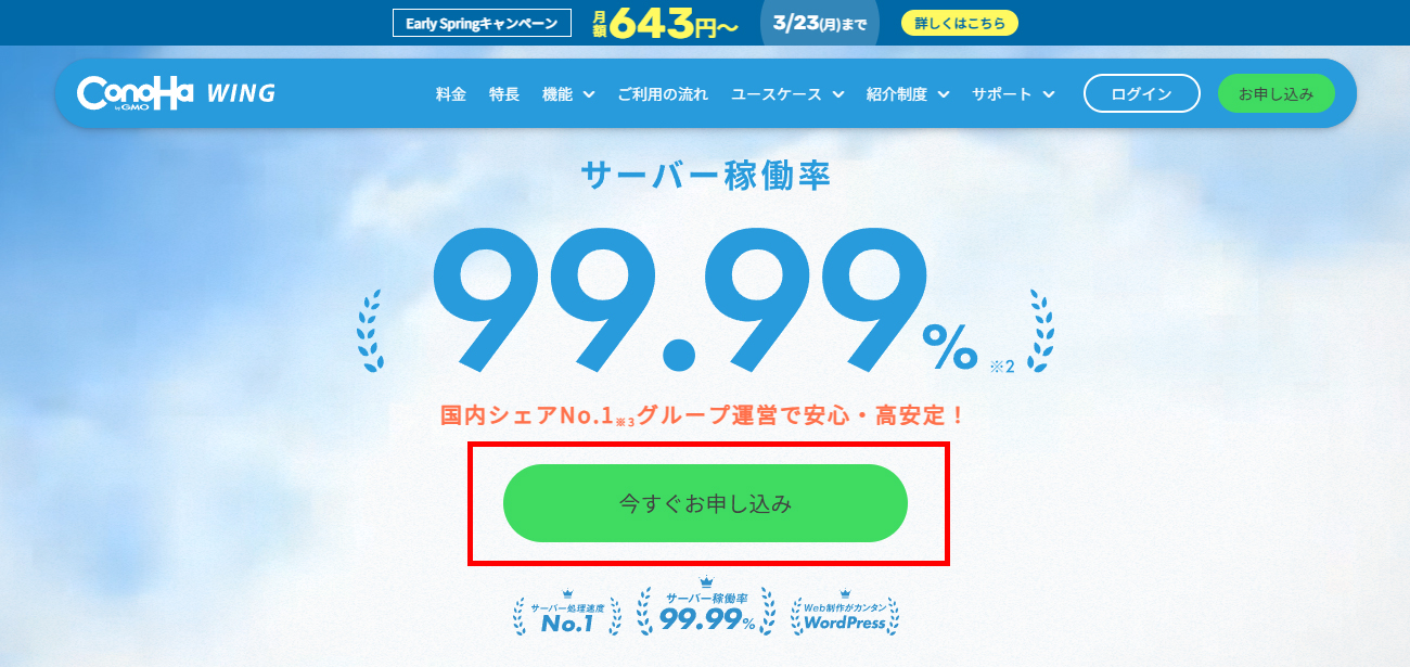 ConoHa WINGの申し込みページにアクセス後、「今すぐお申込み」ボタンを押します。