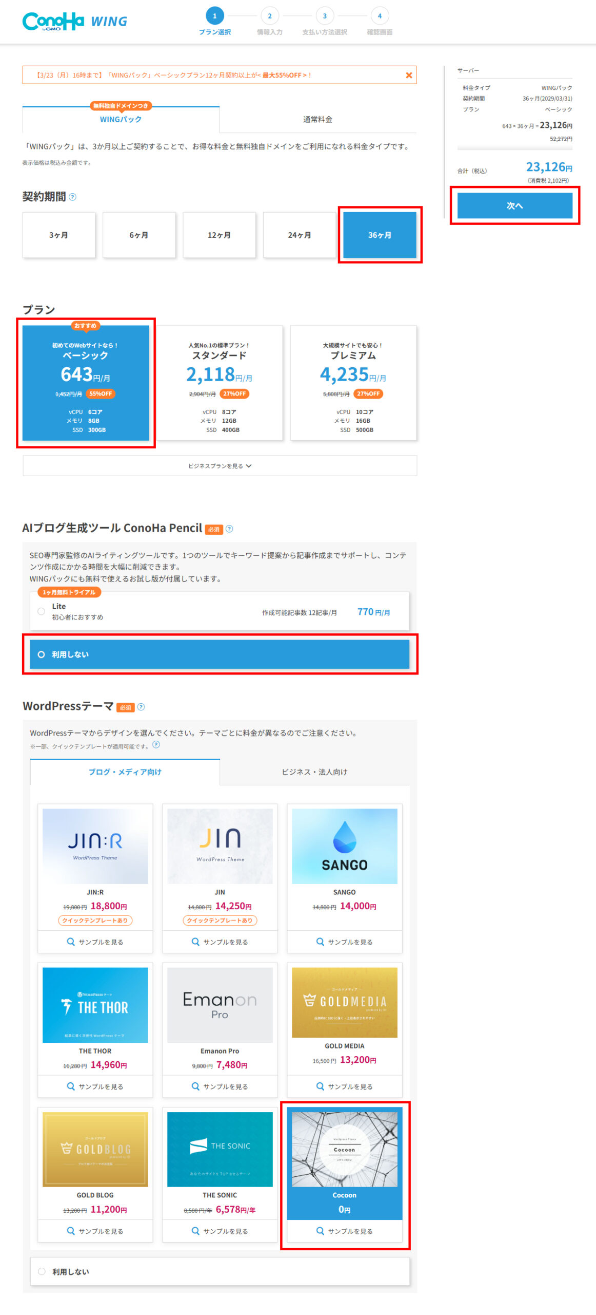 契約期間・プラン・AIブログ生成ツール・WordPressテーマを選択して「次へ」ボタンを押します。