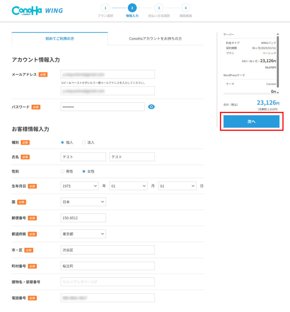 アカウント情報・お客様情報を入力して「次へ」ボタンを押します。