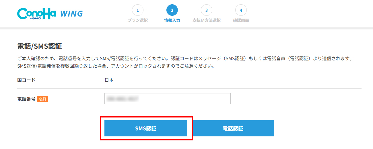 電話番号を入力して「SMS認証」または「電話認証」を押します。