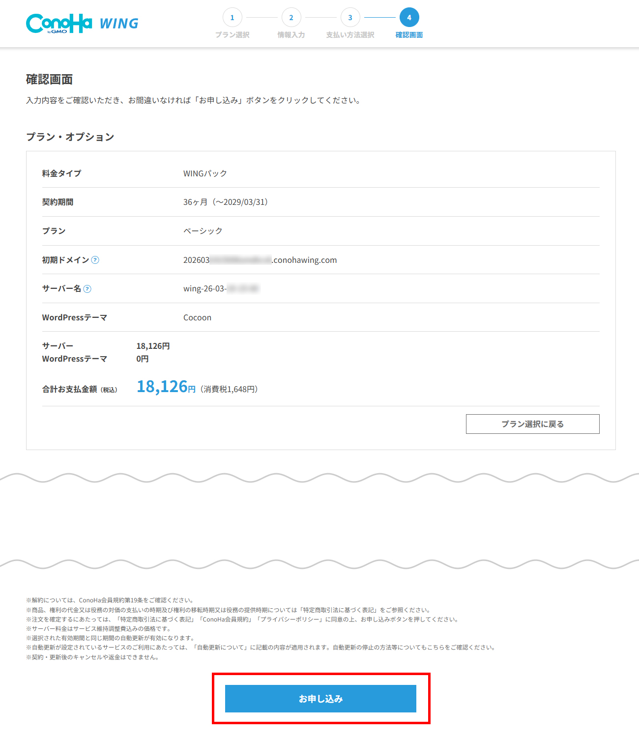 当ブログ限定の紹介リンクからConoHa WINGの申し込みページにアクセスします。