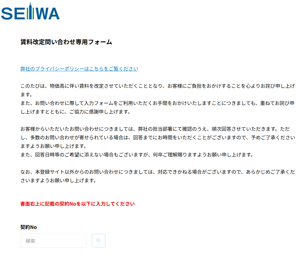 問い合わせフォームには「契約No」の入力が必須となっており、「書面右上に記載の契約Noを入力してください」と案内がありました。