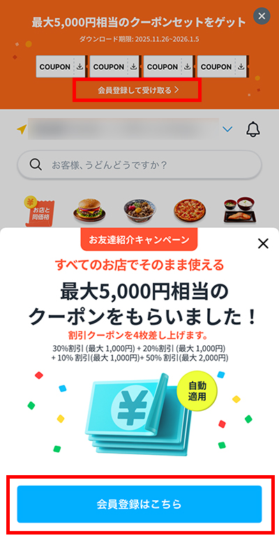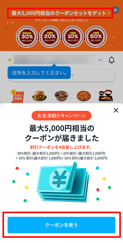 「最大5,000円相当のクーポンセットをゲット」または「クーポンを使う」ボタンを押すと、取得した友達紹介クーポンを確認できます。
