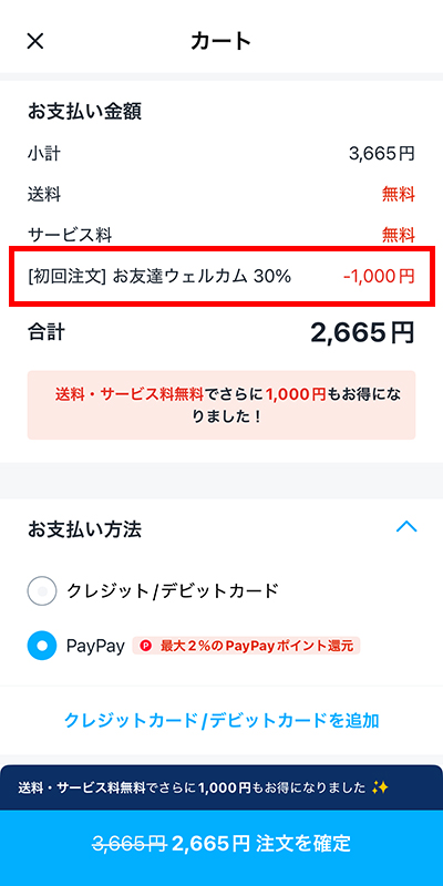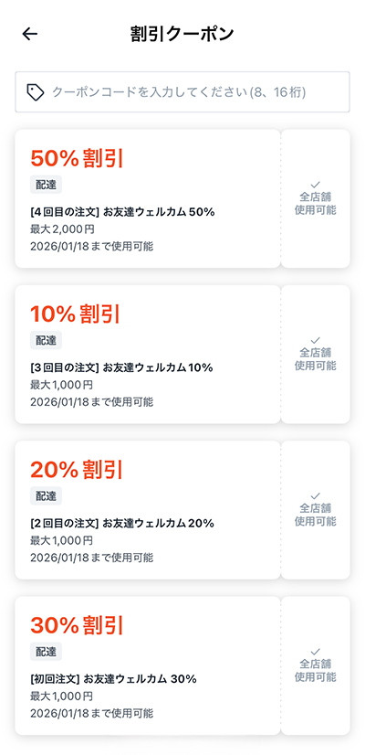 取得した友達紹介クーポンは、デリバリー注文時のカート画面で自動で適用されます。
