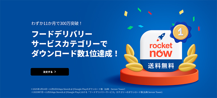 「ロケットナウ」は、送料・サービス料が無料のフードデリバリーアプリです。